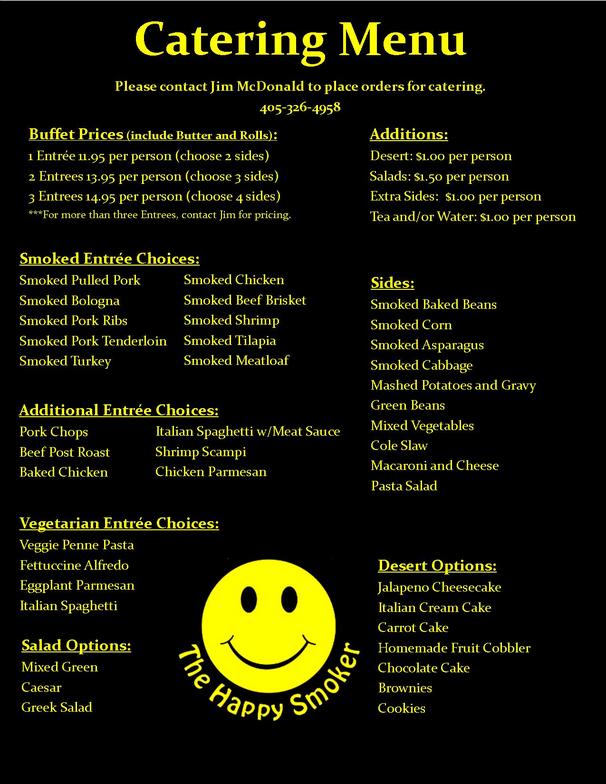 Our menu is so broad it is taking us quite a long time to put it together. Below is a very condenced menu...but it is a starter. Please contact Jim at 405-326-4958 for catering information and to schedule your next event.